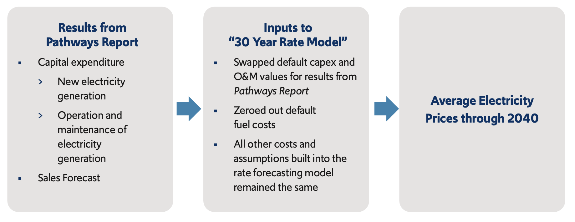 By 2030 electricity rates are projected to be 4.7 cents per kWh higher than a 2.5 percent annual inflation trend, and 6 cents higher than if rates had continued to grow at the average annual rate of the previous decade (0.6% annual increase). By 2035, rates are projected to be 5.5 cents per kWh above the trend growing at the assumed inflation rate and 8.3 cents per kWh above the historic growth trend rate.