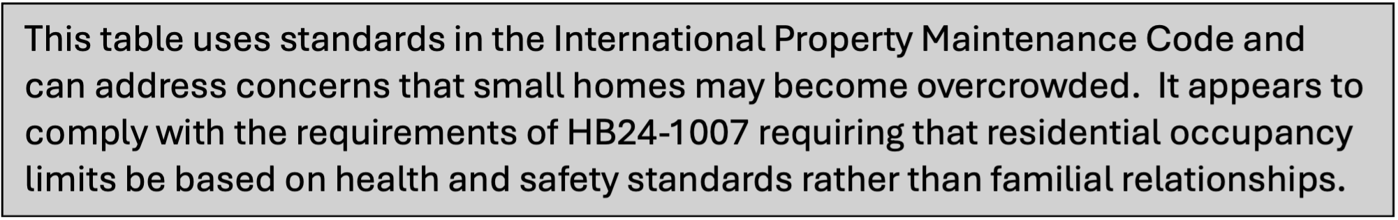 The maximum occupancy of each Starter Home shall be as shown in the following table.