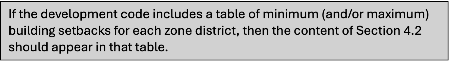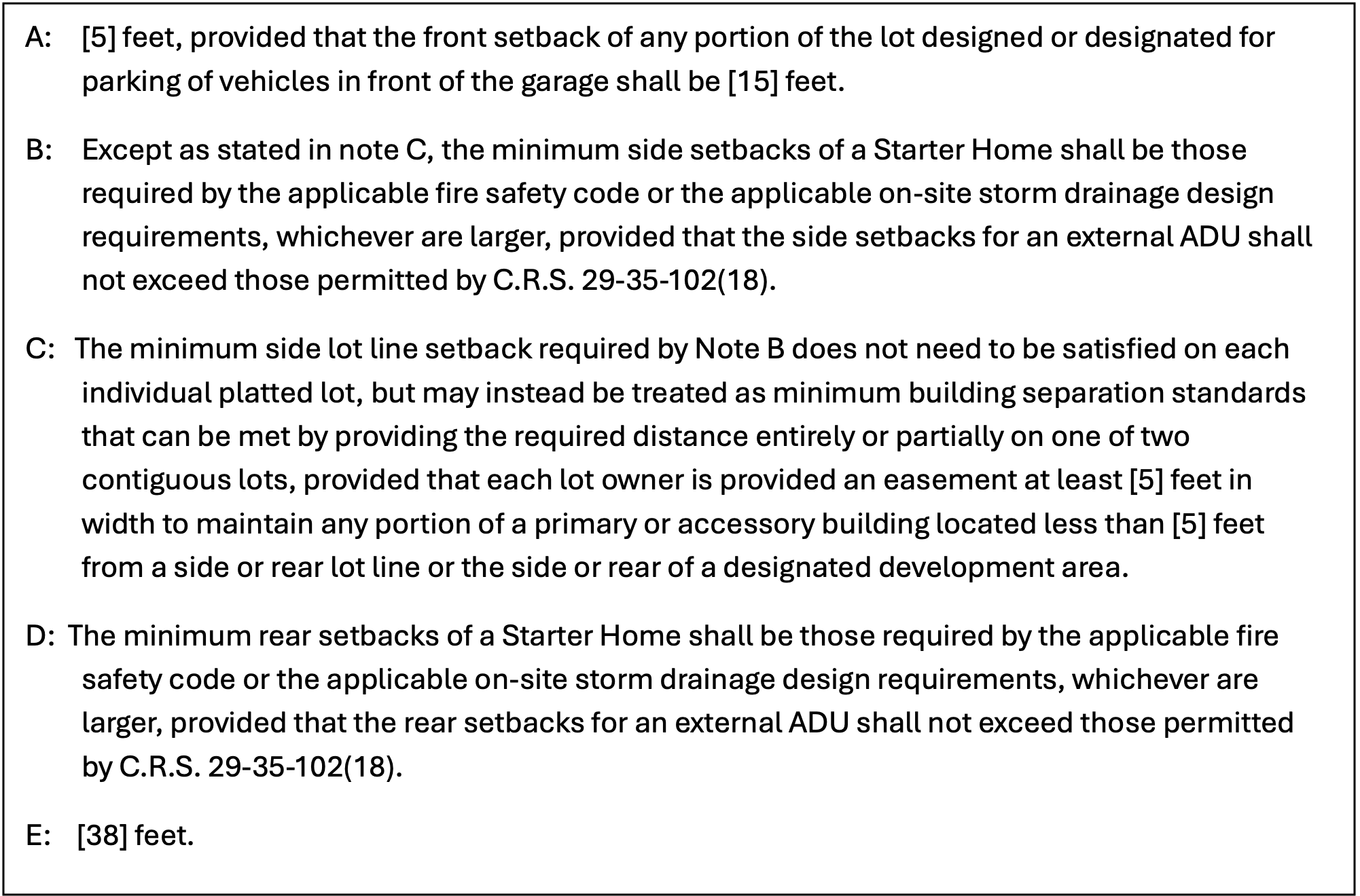 4.1.2. The minimum side and rear setbacks of a Starter Home shall be those required by the adopted fire safety code or the adopted on-site storm drainage design requirements, whichever are larger, provided that the side and rear setbacks for an external ADU shall not exceed those permitted by C.R.S. 29-35-102(18).