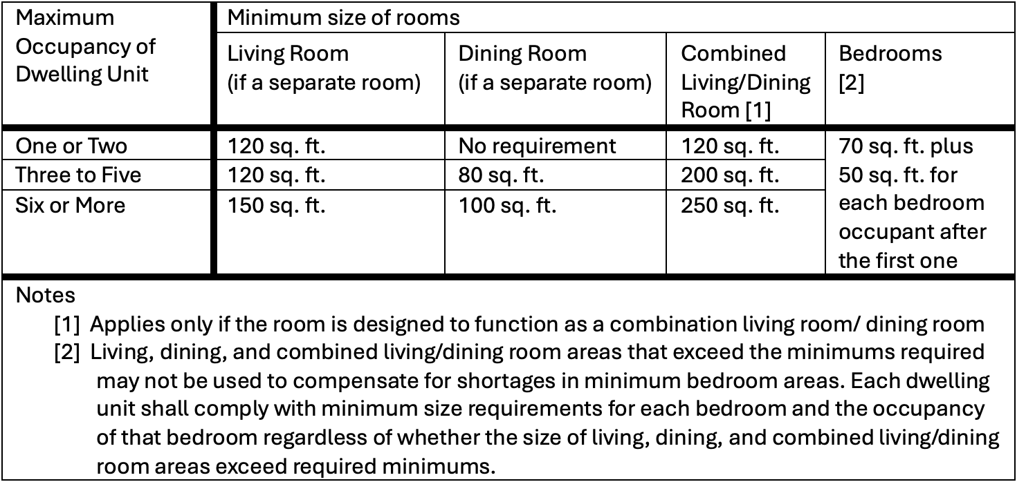 4.5.1. The minimum size of each Starter Home shall be that required by the adopted version of the International Residential Code, based on the types of rooms and the number of bedrooms included in that dwelling.