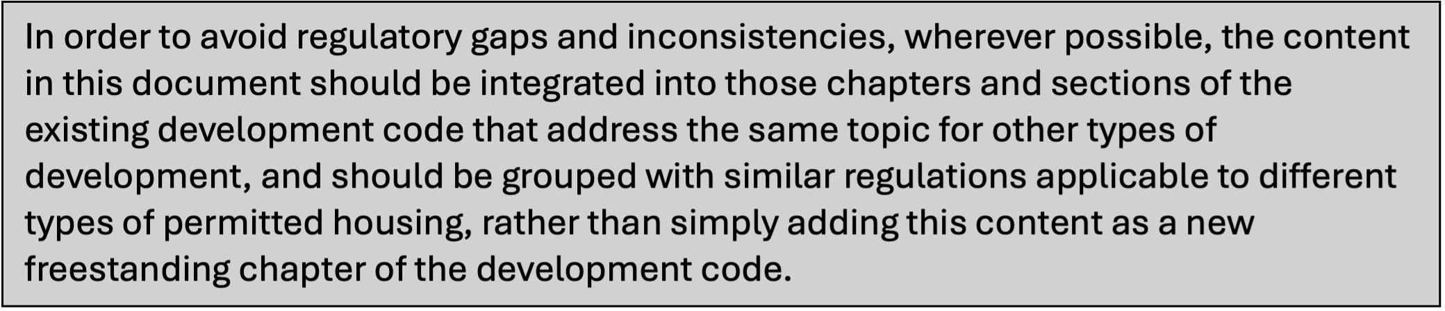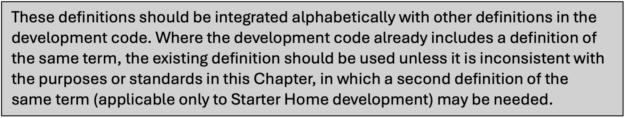 The following sections of this [development code] shall continue to apply to Starter Home development authorized by this Chapter, unless modified as listed below. In case of direct conflict between any standard in a different Chapter of this [development code] or regulation and the standards in this Chapter, the provisions in this Chapter shall apply.