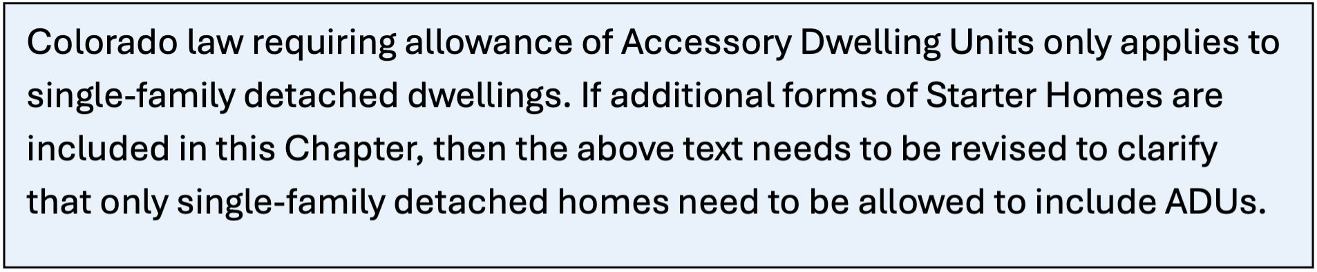 [OPTION] One external Accessory Dwelling Unit containing between 500 and 800 square feet of gross floor area, located outside the exterior walls of each Starter Home, and subject only to those standards permitted by C.R.S. 29-35-101 et. seq.