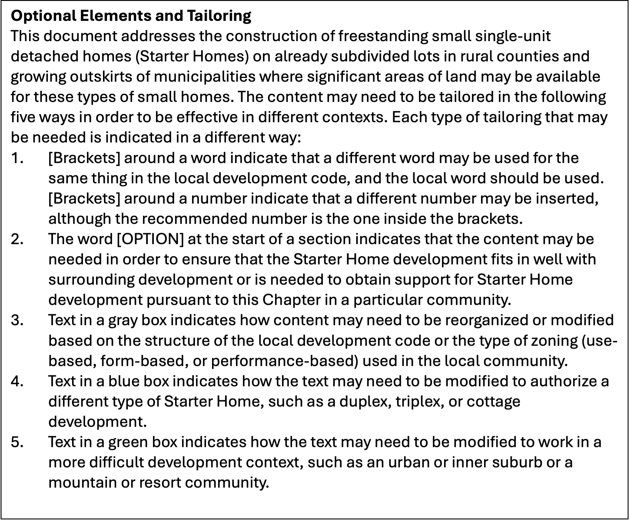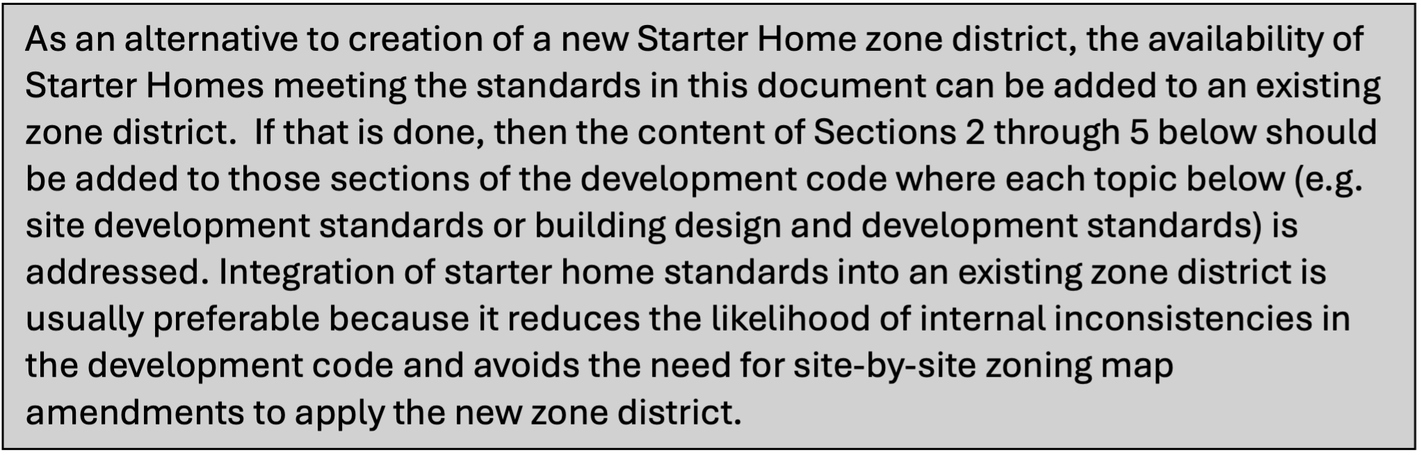 This document describes a simple approach to authorizing development of small detached single-family homes that can open up new opportunities for affordable homeownership through construction of types and sizes of homes often prohibited by local zoning codes. Once land is zoned into the proposed R-SH (Residential Starter Home) zone district and land has been subdivided, all aspects of a Starter Home development can be approved administratively and staff are given significant flexibility to approve proposed developments that meet the intent of the R-SH zone district even if the specifics of the development do not exactly meet the development standards in this document.