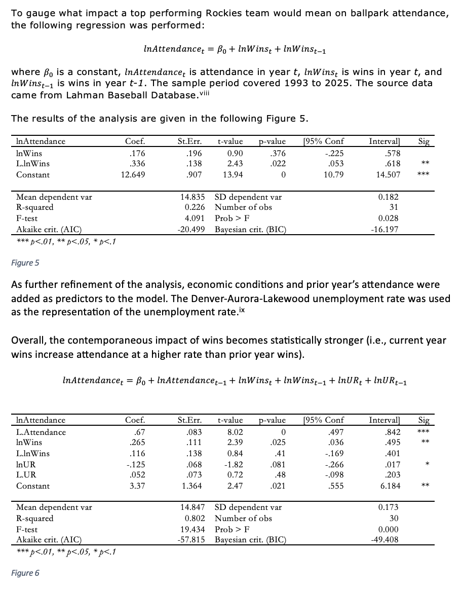 The analysis is divided into three sections. The first section looks at the relationship between attendance and wins, finding that winning teams, including past Rockies teams, had stronger attendance. The second section estimates the number of out-of-town visitors to Denver at Rockies home games. The third section evaluates what a trip to the MLB playoffs would mean for Colorado’s capital city. These three combine to form an estimate of the overall economic impact for Colorado should the Rockies find a way to improve from last in 2025 to first in 2026.